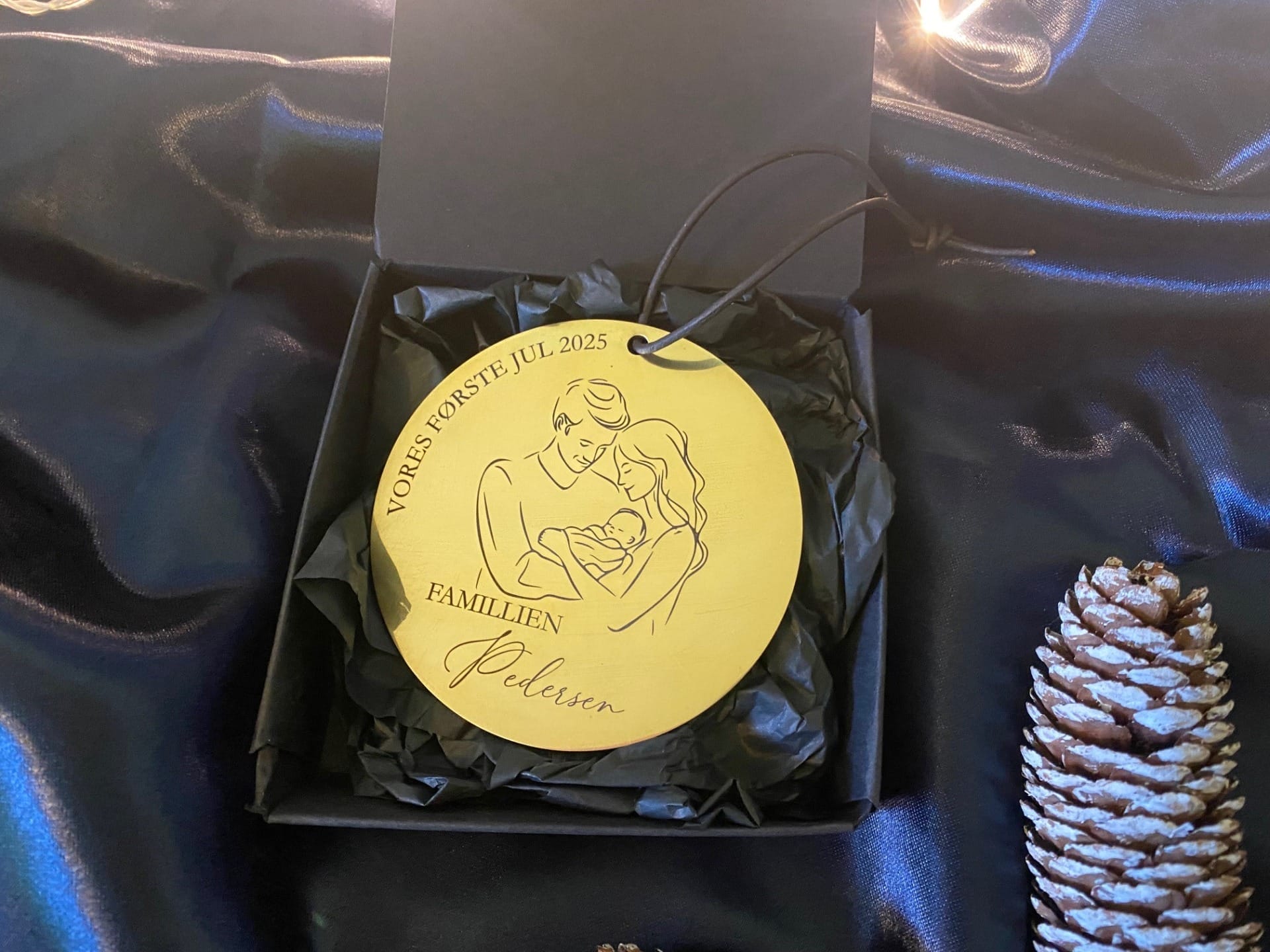 Gør juletræet ekstra særligt i år med et elegant juleornament i messing, der kan personliggøres med både tekst og familienavn. Ornamentet har et tidløst motiv af en lykkelig familie – mor, far og deres nyfødte baby – som gør det til et rørende minde om livets største øjeblikke.