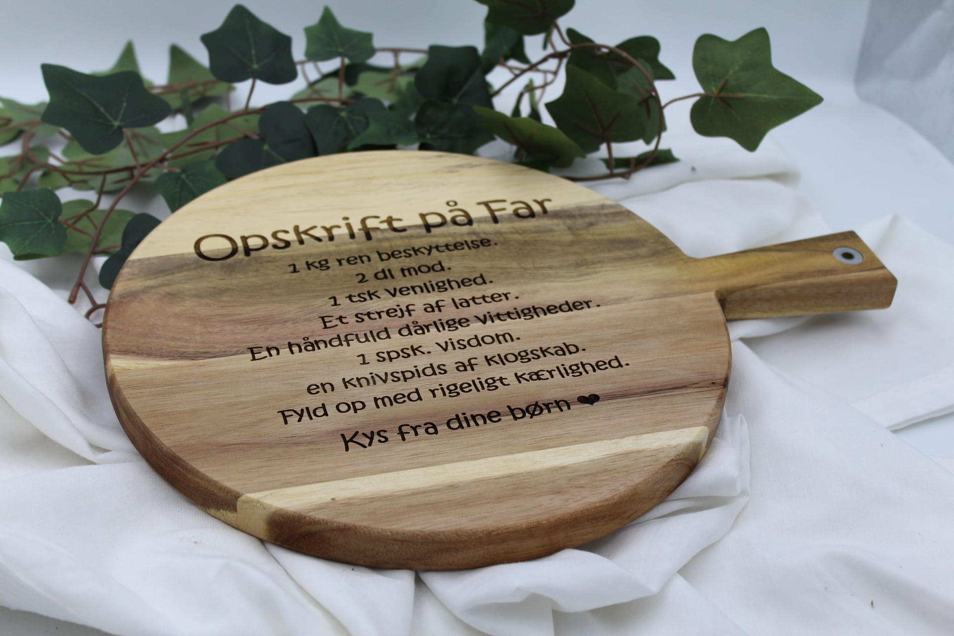 For at gøre dette pizza skærebræt “Opskrift på Far” ekstra specielt, kan du få en personlig gravering som en hyldest til far. Hvad enten det er en sød besked. Et inspirerende citat eller et kærligt minde, så kan graveringen tilføje en personlig og unik dimension til gaven. En gravering gør skærebrættet endnu mere betydningsfuldt og bliver en gave, far vil værdsætte i lang tid.