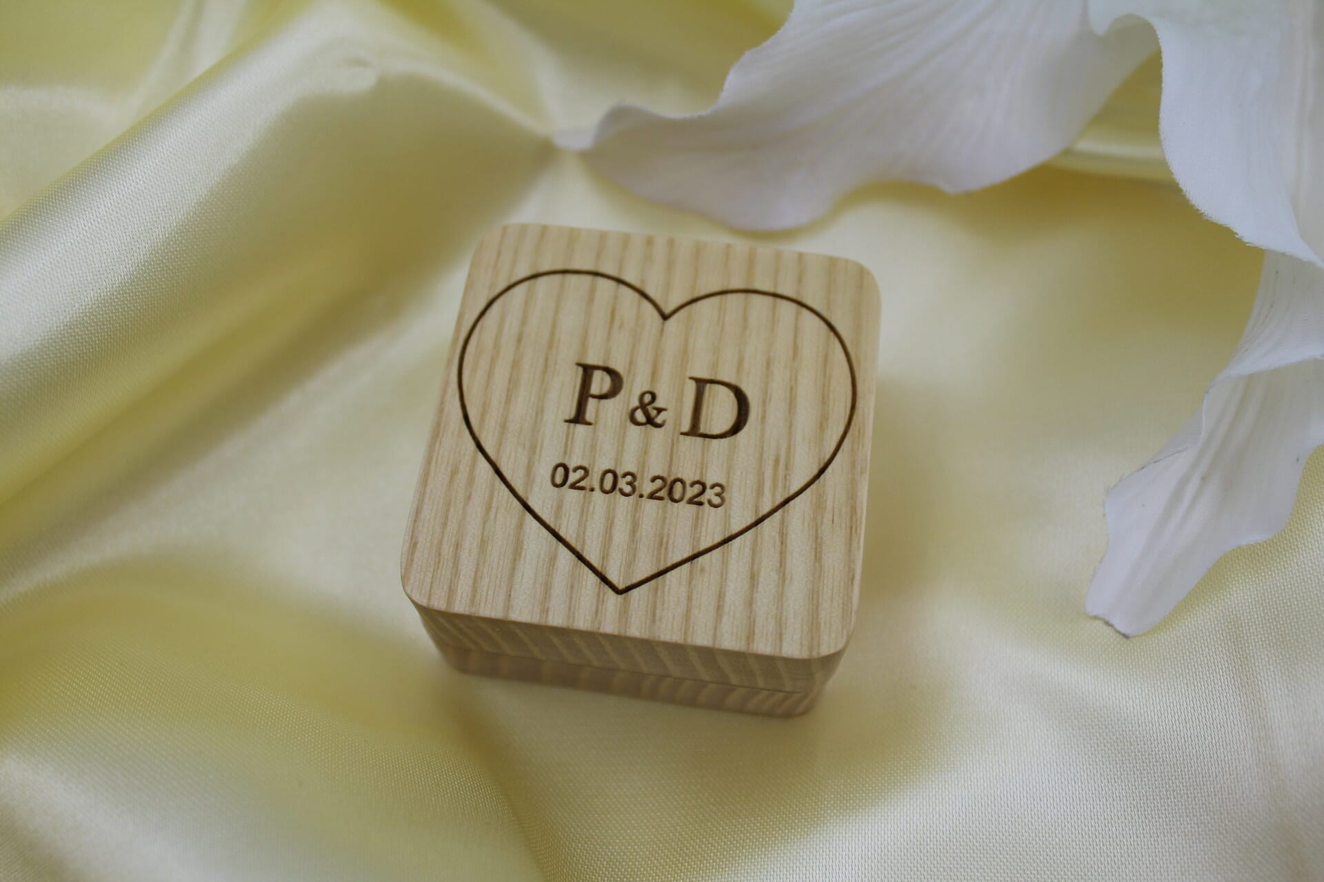 I hjertet af denne æske ligger en særlig historie, jeres historie. Med vores unikke hjerte-motiv er initialerne af brudeparrets navne elegant indrammet, skabende en betagende visuel hyldest til jeres forening. Den personlige indgravering kan også inkludere datoen for jeres store begivenhed, der bliver til et evigt minde om jeres kærlighedshistorie.
