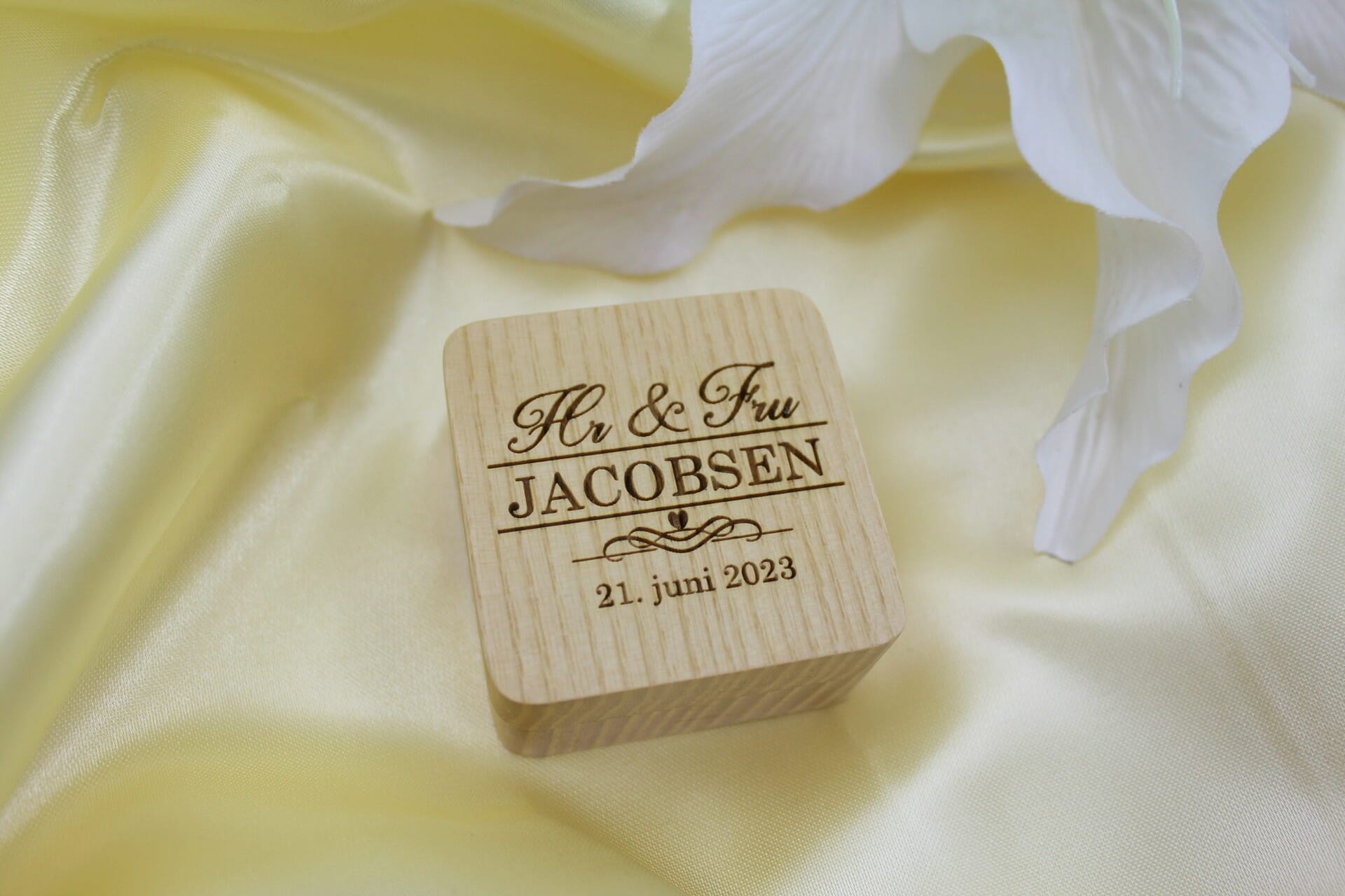 Vores Ringæske Hr & Fru ‘Square’ i træ er skabt til at hylde de mest skelsættende øjeblikke i livet. Med et specielt Hr & Fru motiv samt brudeparrets familienavn indgraveret på låget, bliver denne æske et unikt vidnesbyrd om jeres kærlighedshistorie. Den personlige gravering fortæller en historie, der er lige så unik som jeres forhold. Tilføjelsen af begivenhedens dato giver en tidløs dimension til denne smukke æske.