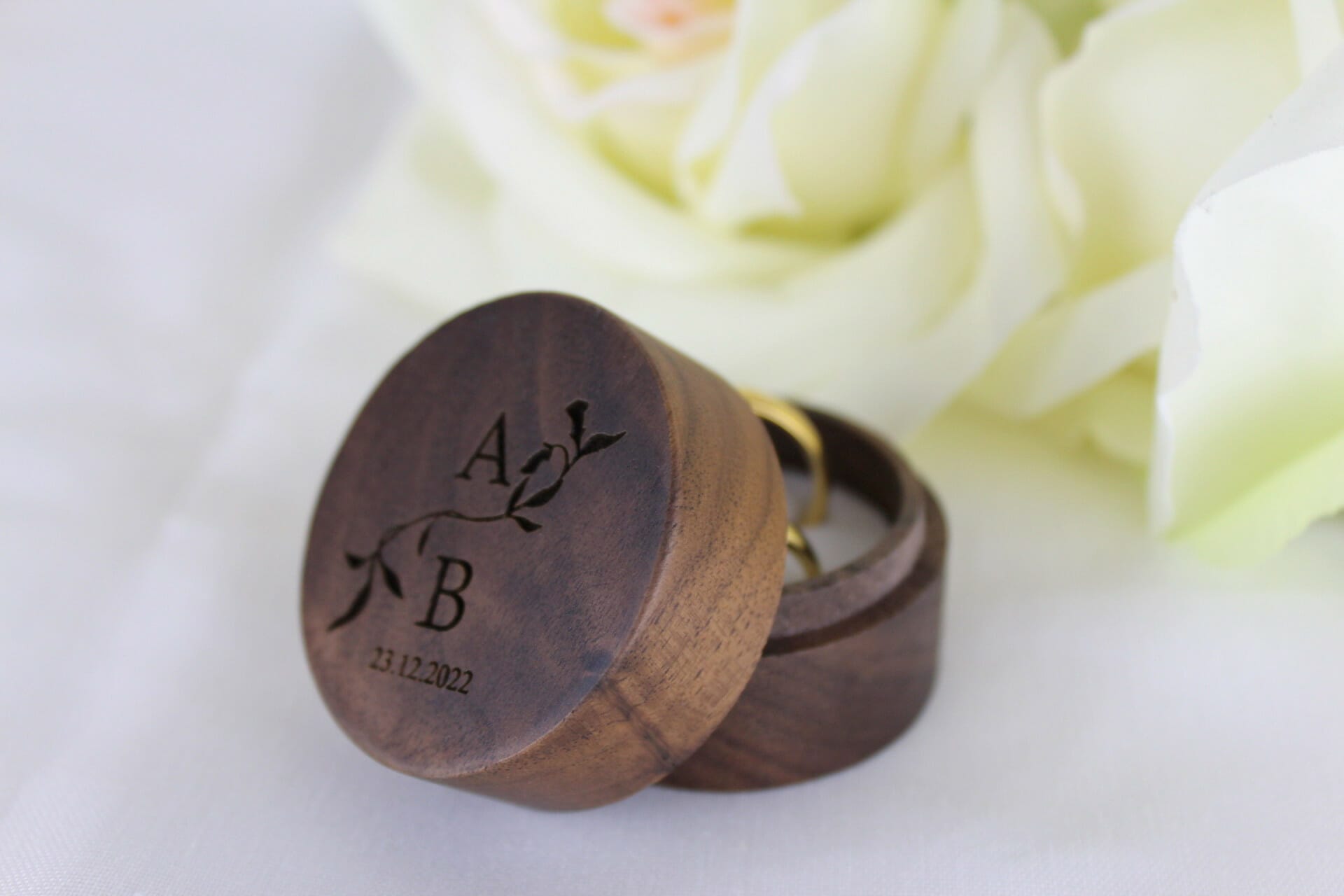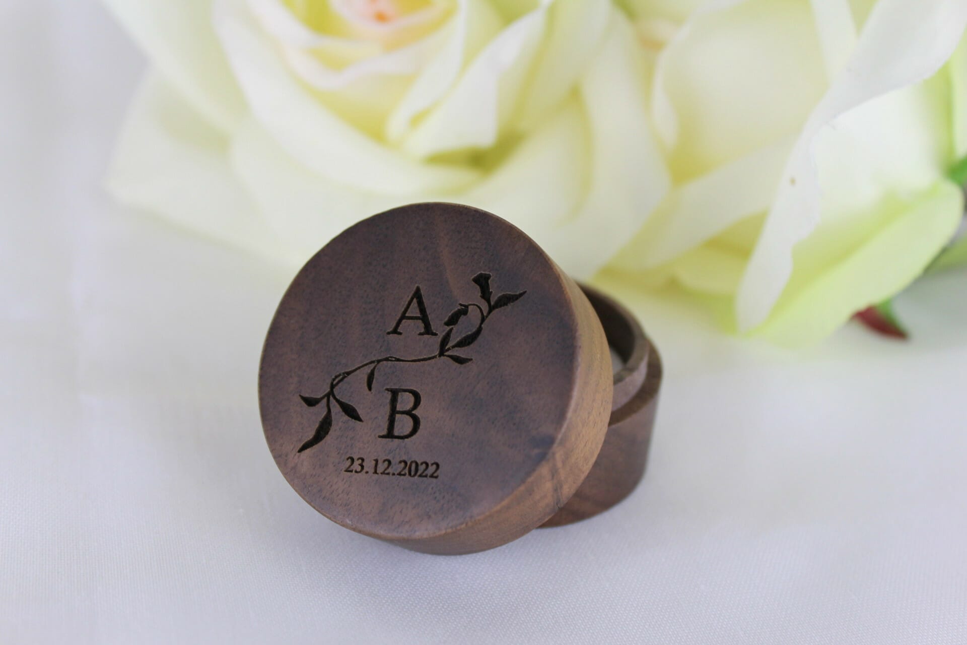 Det luksuriøse valnødtræ, præcisionen i graveringen og det skræddersyede design kombineres med praktisk funktionalitet. Æskens indvendige mål på Ø50 og 36mm højde sikrer, at den passer til en bred vifte af ringstørrelser, og valget mellem hvidt eller sort smykkeskum giver en elegant kontrast til træets varme toner.