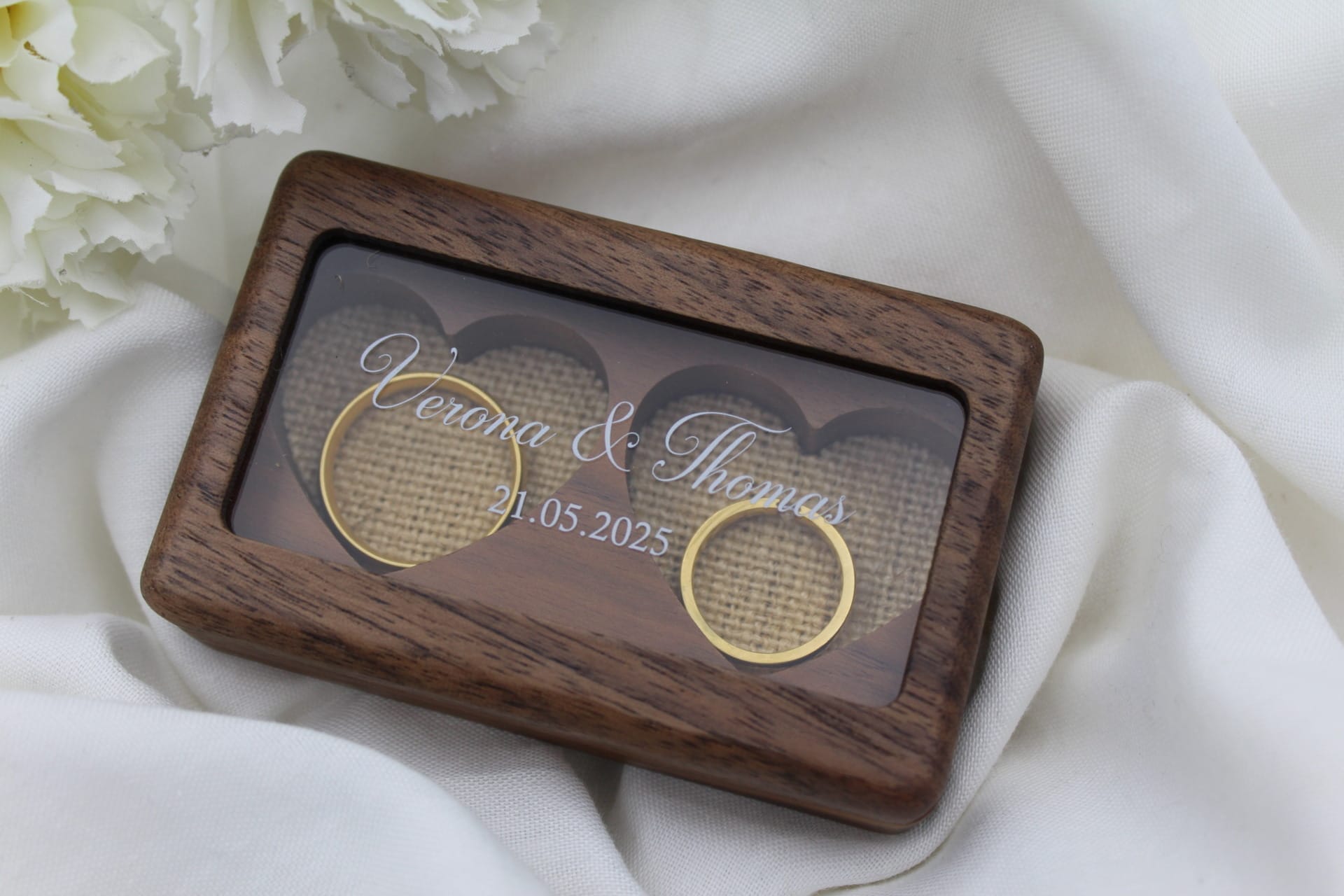 Ringæsken er udstyret med en stilfuld glasfront, der beskytter ringene og samtidig giver en smuk visning. På glasset er der et personligt print med brudeparrets navne og bryllupsdato, trykt med en elegant kursiv skrifttype. Dette unikke design skaber en intim og romantisk detalje, der gør æsken til et smukt minde, som kan bevares i mange år fremover.