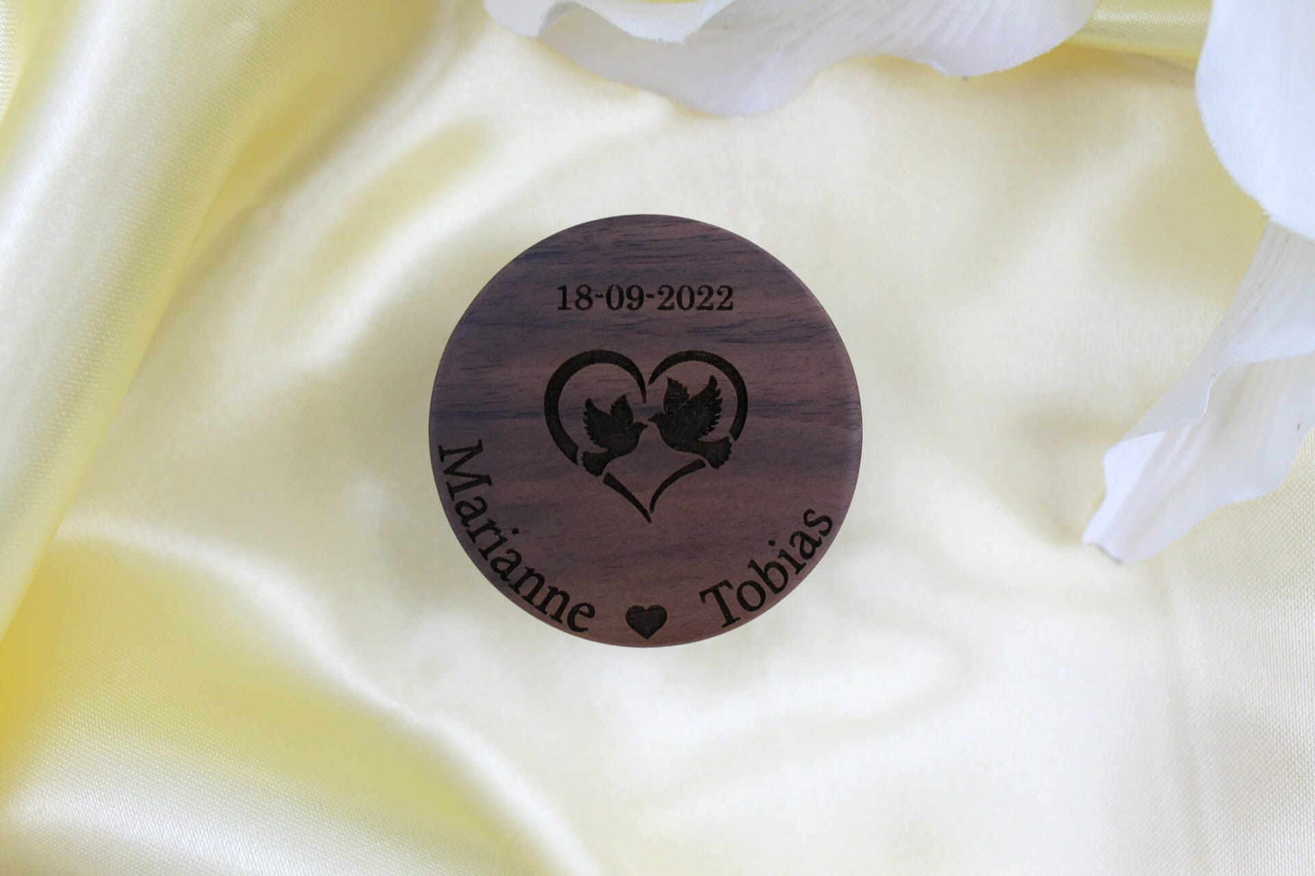 I hjertet af denne smykkeæske finder du et ømt motiv af to turtelduer, der symboliserer kærlighedens styrke og dybde. Under motivet er der plads til at indgravere brudeparrets navne, og over motivet kan datoen for dette skelsættende øjeblik stråle. Den personlige prægning gør denne ringæske til en tidsløs skat, der minder jer om jeres særlige bånd.