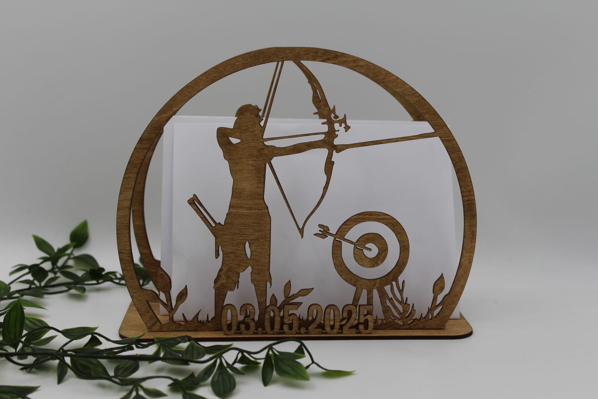 Er du på udkig efter en unik og personlig sangskjuler til en særlig begivenhed? Vores sangskjuler i træ, udskåret med et detaljeret motiv af en bueskytte i landlige omgivelser, er den perfekte sangskjuler til både bueskydning-entusiaster og dem, der elsker personlige, smukke detaljer. Denne sangskjuler bringer ikke kun minder frem under festlige lejligheder, men kan også pynte på værelset i mange år fremover.