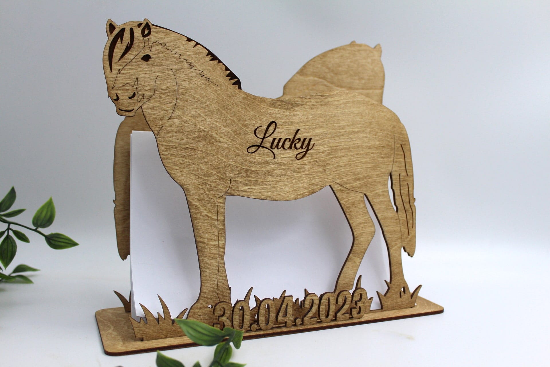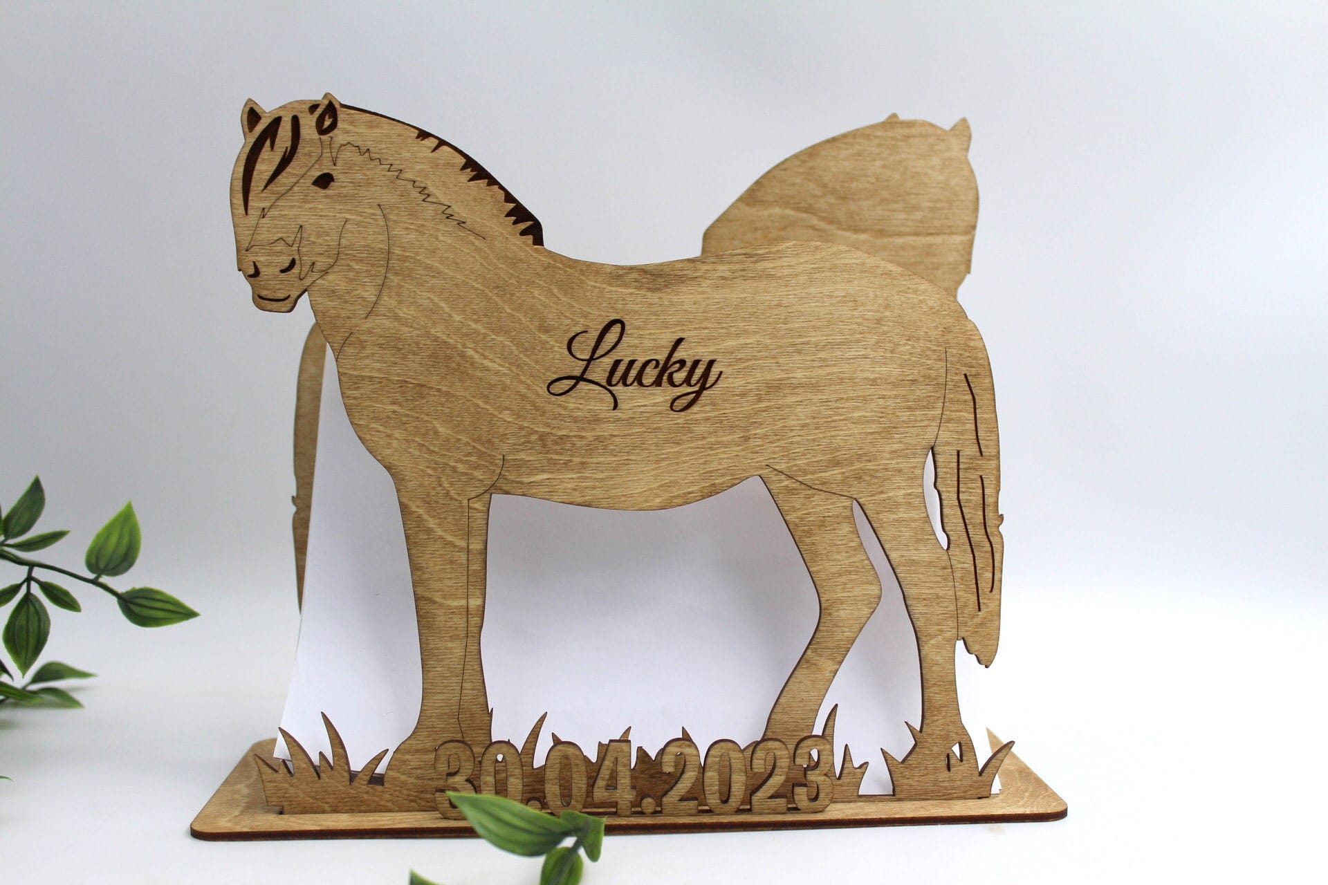 Denne sangskjuler er en fantastisk måde at give din fest et personligt præg. Den er udskåret i træ med præcision og omhu, og dens hestetema vil helt sikkert tilføje en autentisk og naturlig detalje til din festdekoration. Du kan også få indgraveret en personlig tekst på siden af hesten for at gøre den endnu mere personlig.