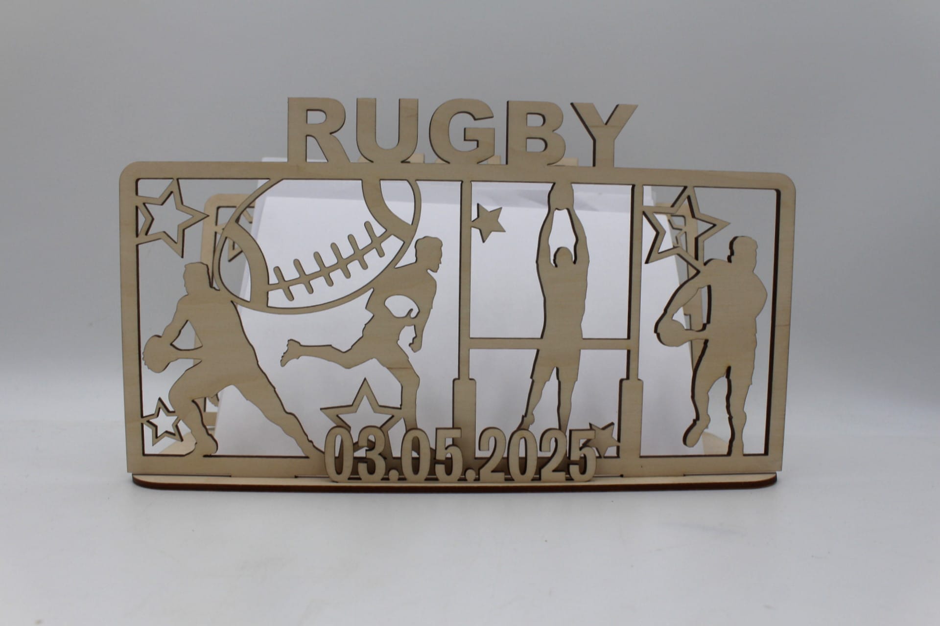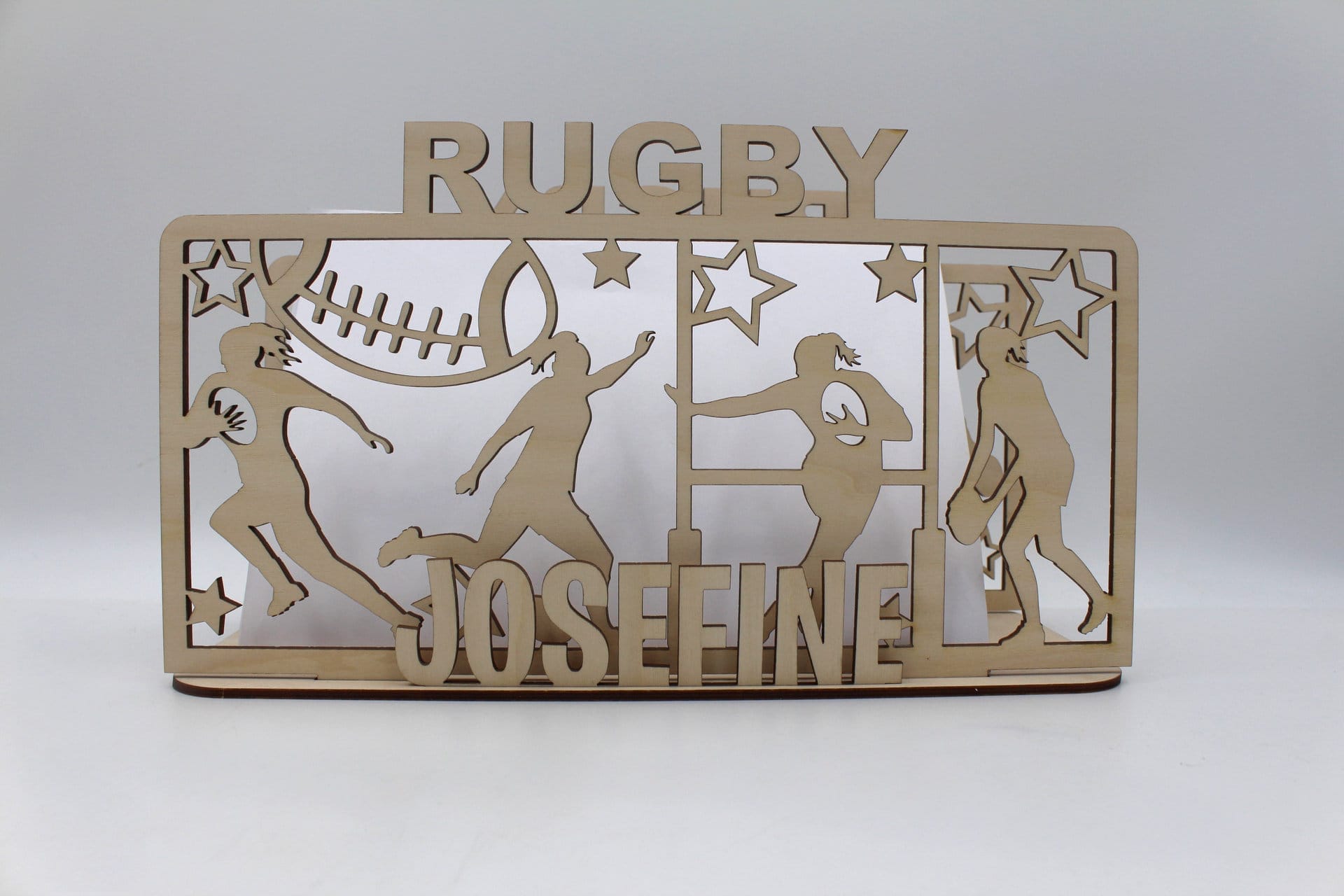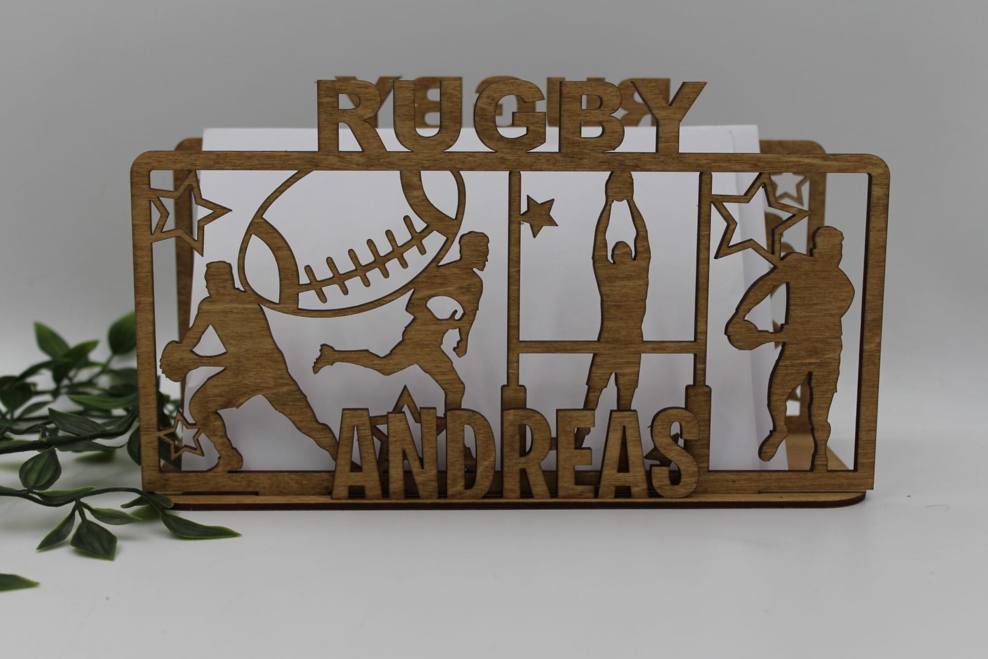 Leder du efter en unik sangskjuler, der skiller sig ud og samtidig har et personligt touch? Denne sangskjuler i træ med et motiv af en rugbyspiller er det perfekte valg! Den skaber ikke kun en sjov og kreativ stemning ved enhver fest, men vil også pynte flot på bordet som et dekorativt element. Perfekt til konfirmationen, fødselsdagen eller andre specielle begivenheder, hvor sport og personlighed spiller en vigtig rolle.