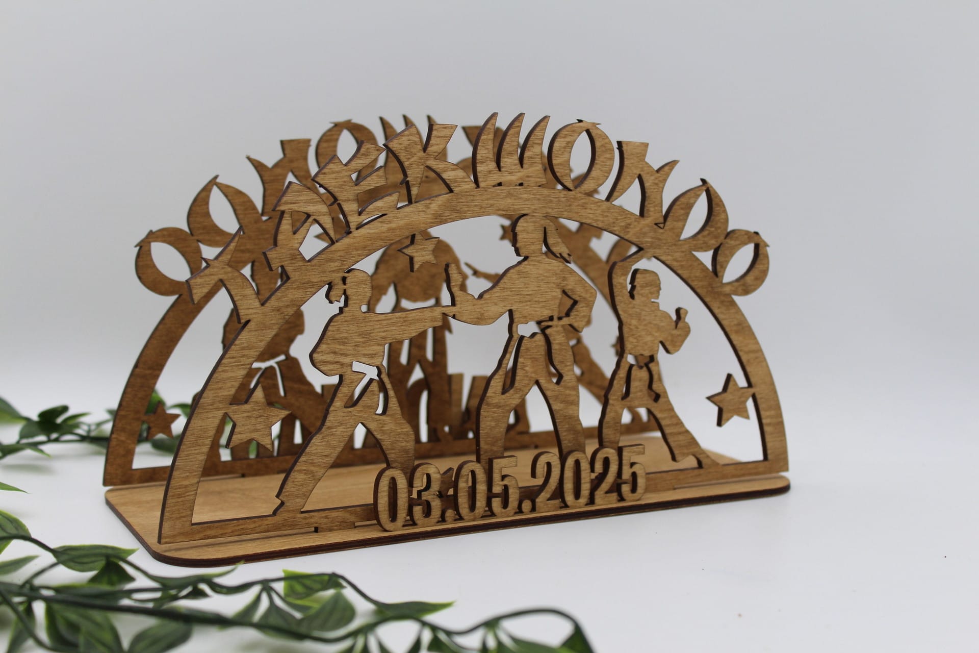 En af de fantastiske funktioner ved denne personlige sangskjuler er muligheden for at tilføje din egen tekst på begge sider af bundpladen. Dette giver sangskjuleren et sjovt 3D-udtryk og tilføjer en ekstra dimension af personlighed. Uanset om du vælger en inspirerende besked, et sjovt citat eller en speciel hilsen, bliver det et minde, der vil blive værdsat i mange år fremover. Den præcise laserskæring af taekwondo-udøveren i træ skaber et smukt, detaljeret design, der virkelig skiller sig ud.