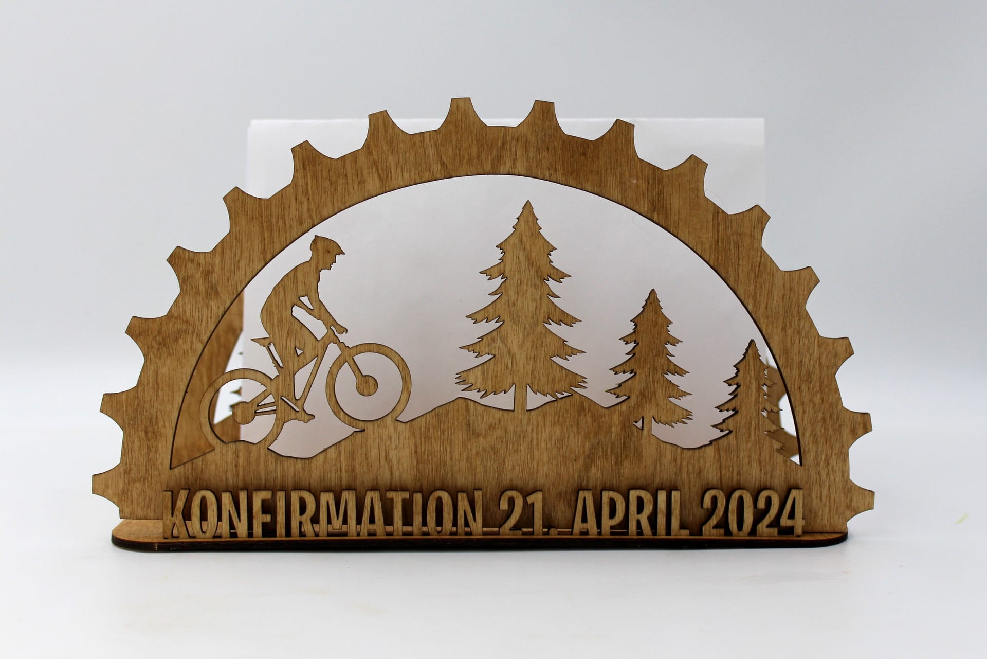 Giv din konfirmationsfest eller særlige begivenhed et personligt præg med vores udskårne træsangskjuler med mountainbike motiv. Det er ikke bare en dekoration; det er en fortælling, et kunstværk og en gave, der varer ved.
