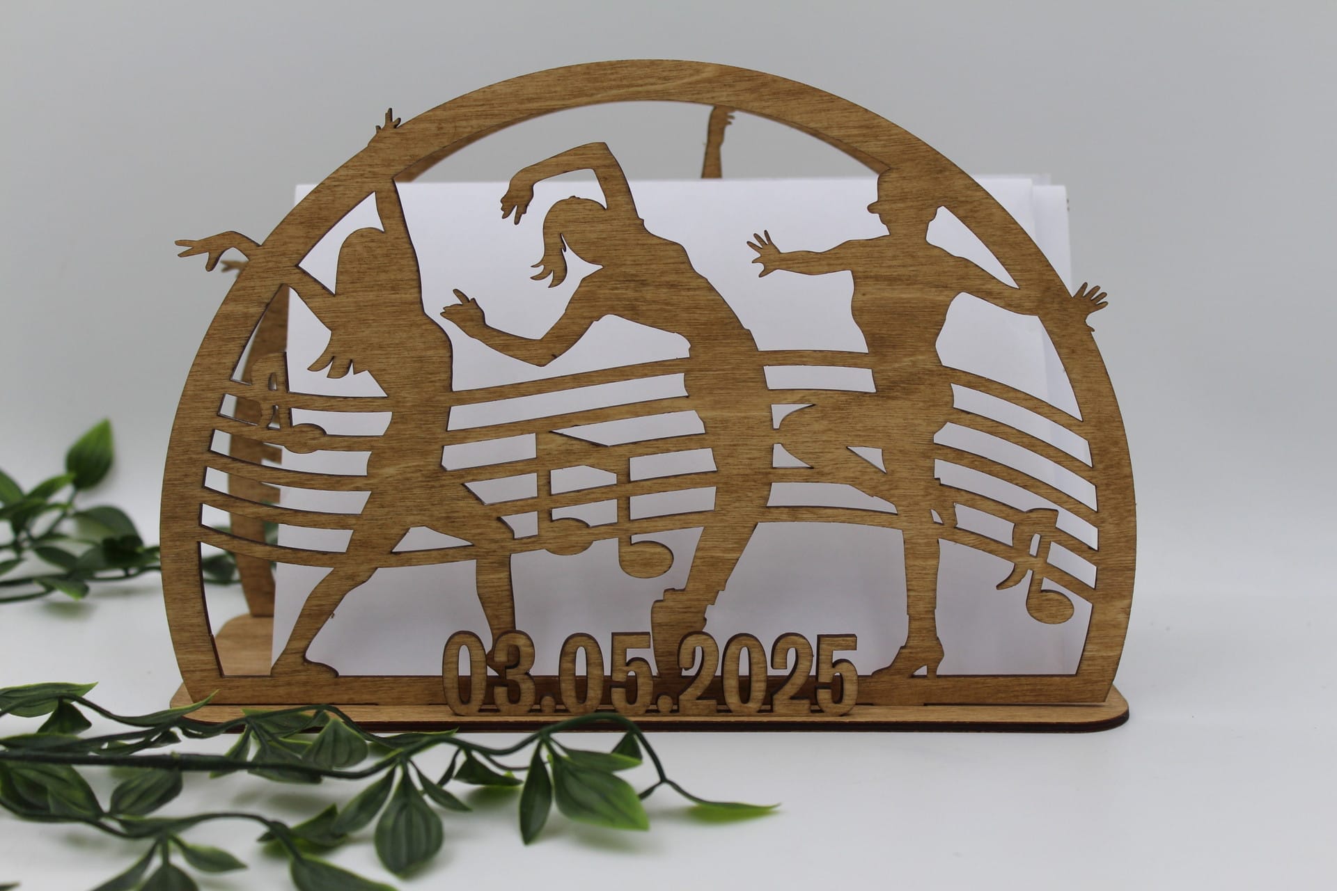 Vores unikke sangskjuler i træ med dansetema. Denne særlige sangskjuler er det perfekte valg til at tilføje en personlig og festlig touch til din konfirmationsfest eller andre specielle begivenheder. Med sin præcisions laser udskårede trækonstruktion skiller denne sangskjuler sig ud som et unikt håndværk.