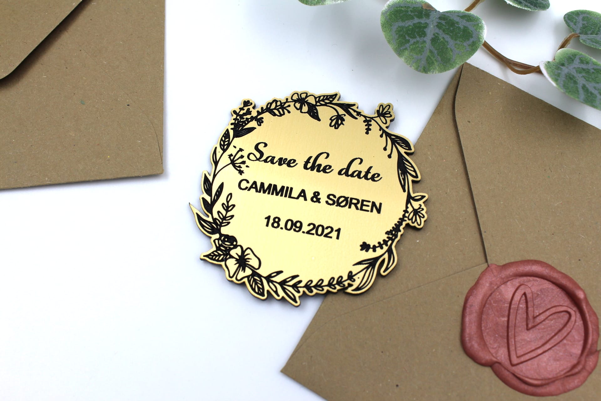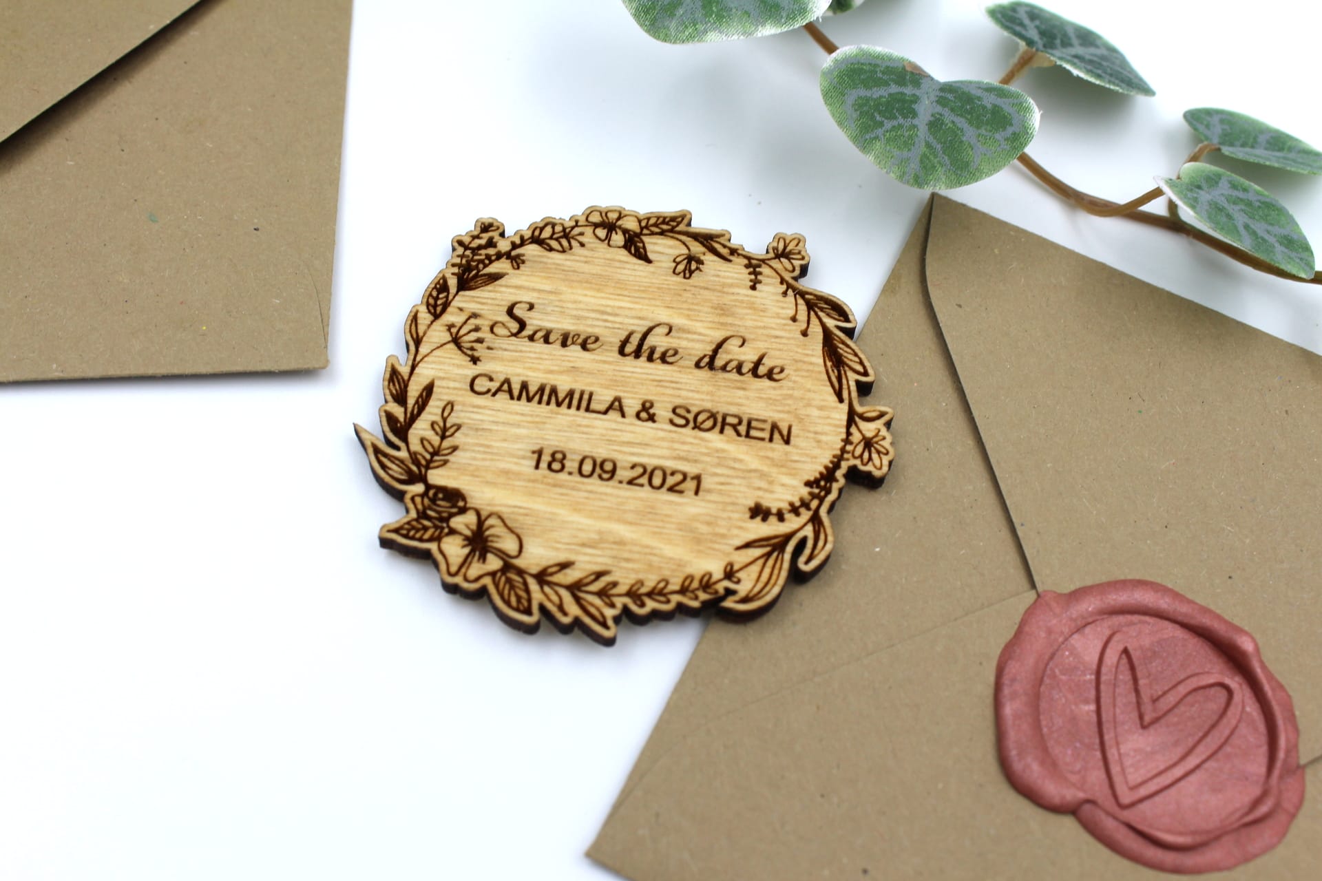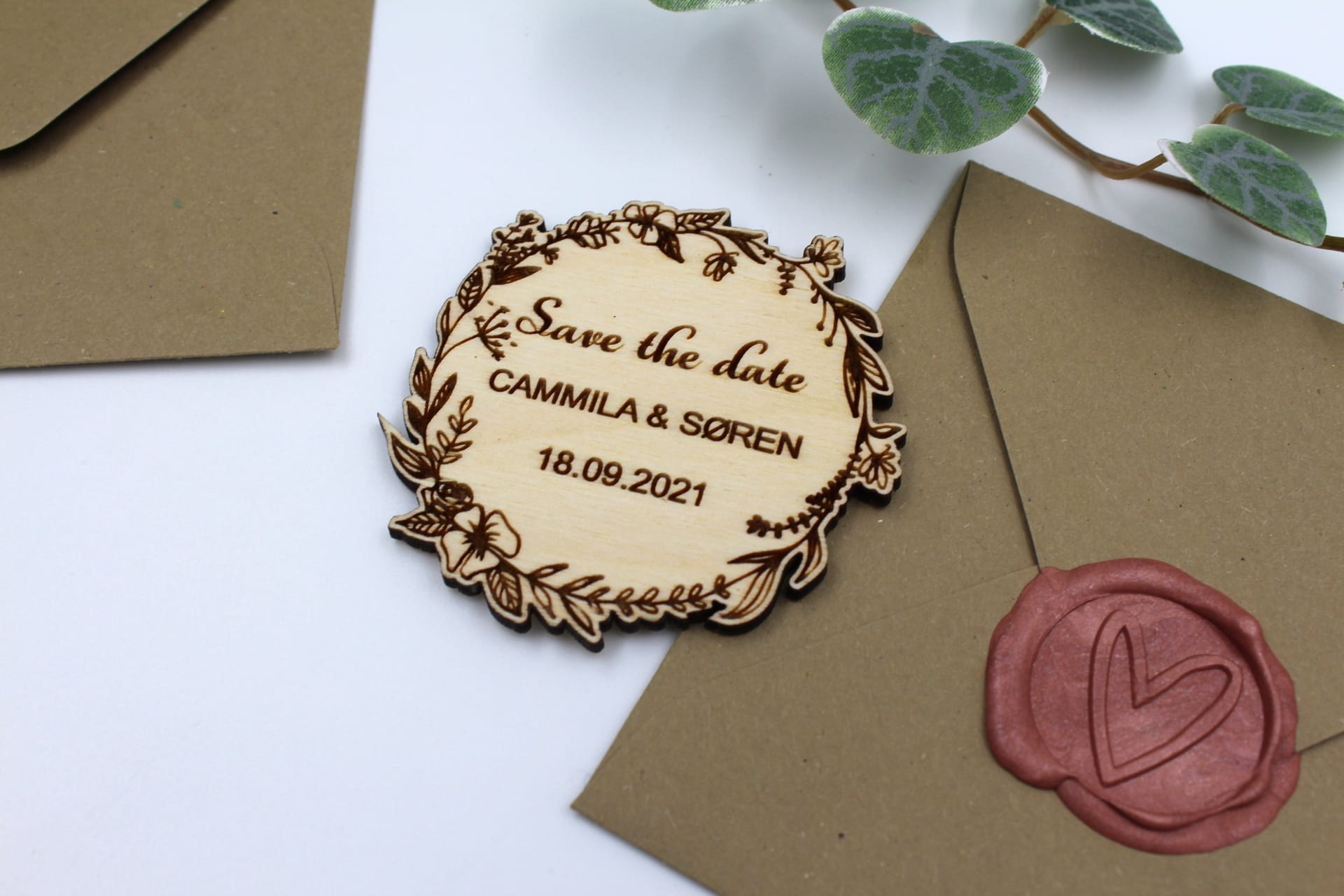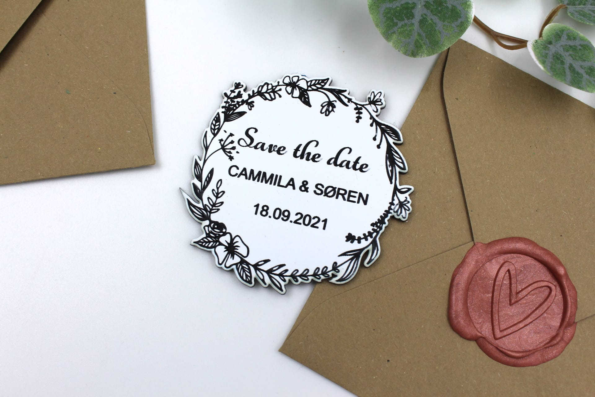 Elegant ‘Save the date’ kort med blomsterkrans inklusiv magnet på bagsiden.