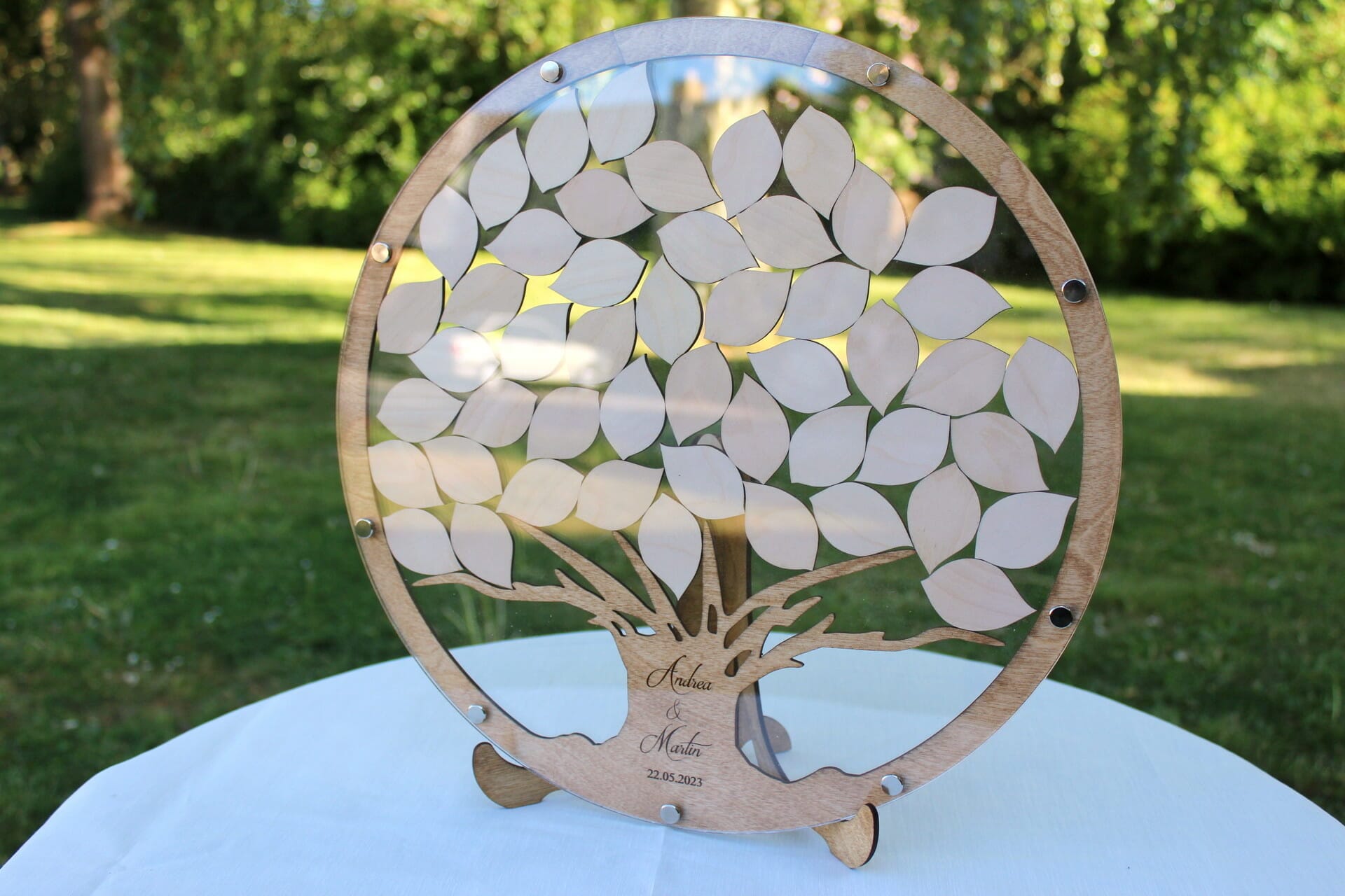 Opdag den unikke og fortryllende atmosfære, vores gæstebog i udskåret træ og akryl kan tilføje til jeres bryllup. Giv jeres gæster mulighed for at være en del af jeres kærlighedshistorie ved at skrive personlige hilsner på de bladeformede brikker, og skab uforglemmelige minder fra denne specielle dag.