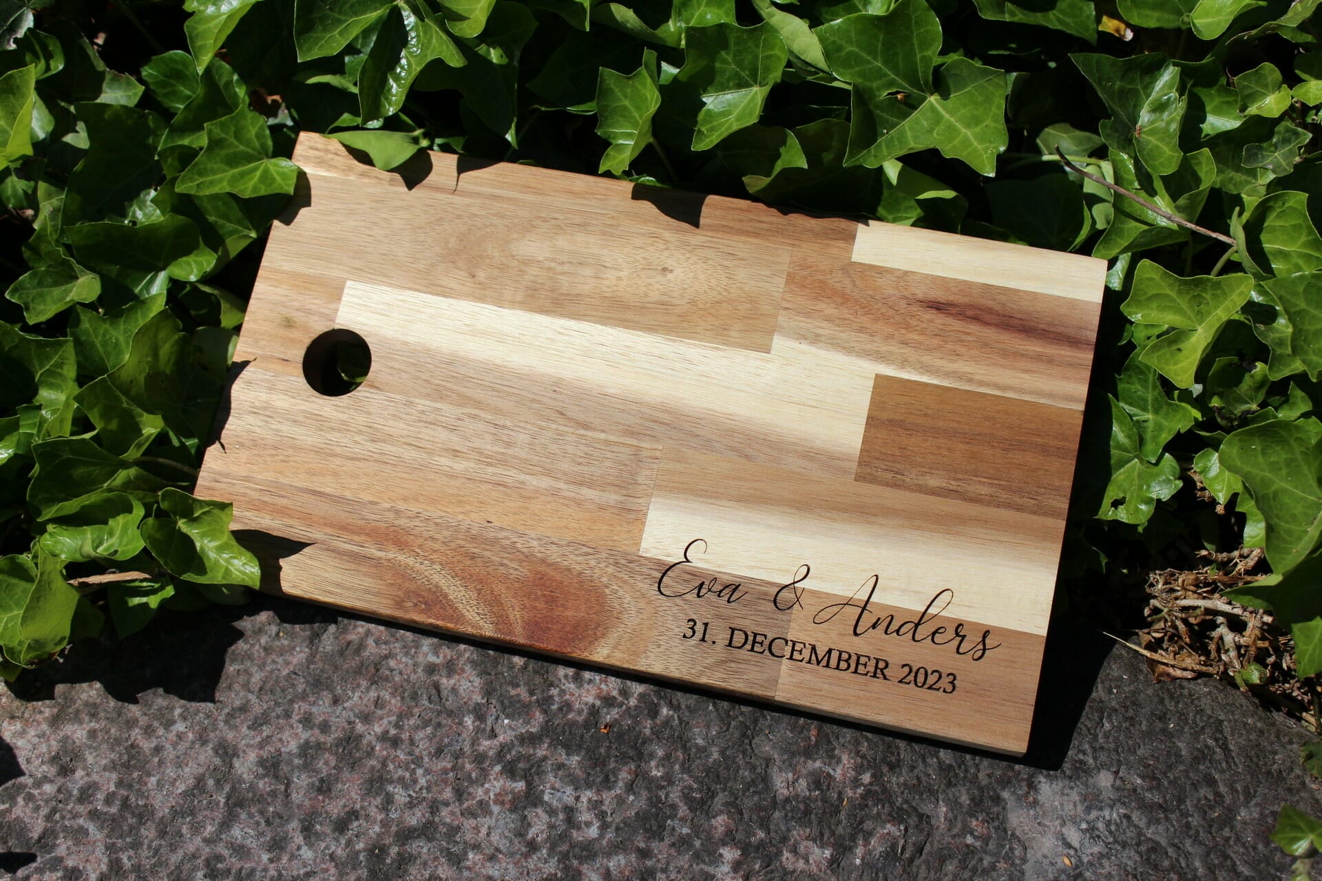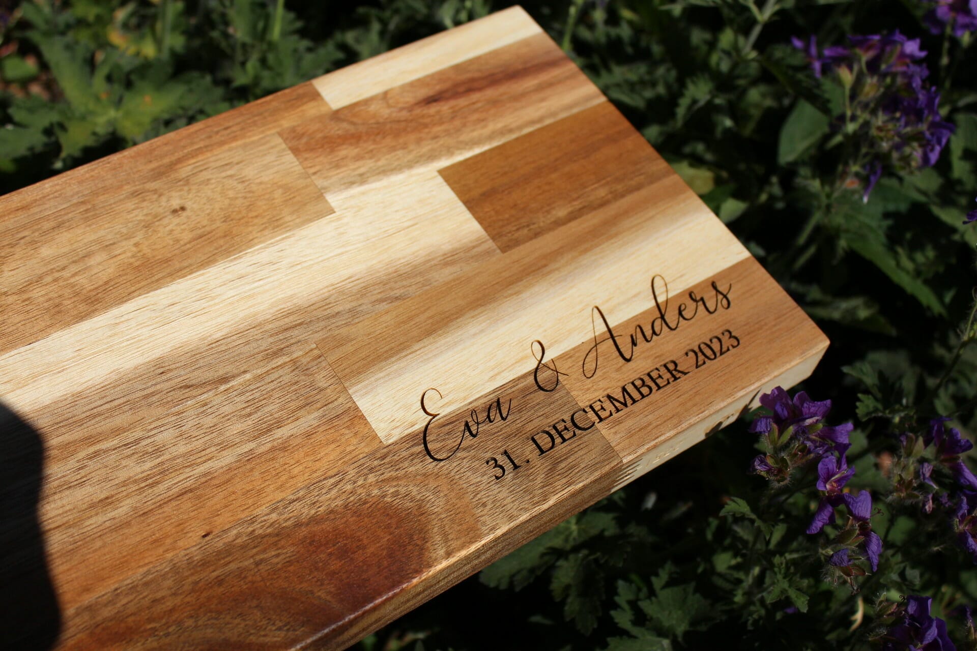 Oplev en ægte perle inden for boligdesign og gaver – vores skærebræt med personlig indgravering af navne og dato. Dette skærebræt er ikke blot et praktisk køkkenredskab, det er et unikt kunstværk, der forener æstetik med funktionalitet. Lavet af smukt stavlimet akacietræ og udført med præcisionsskåret laserindgravering, er dette skærebræt mere end bare en overflade til madlavning – det er en hyldest til uforglemmelige øjeblikke.