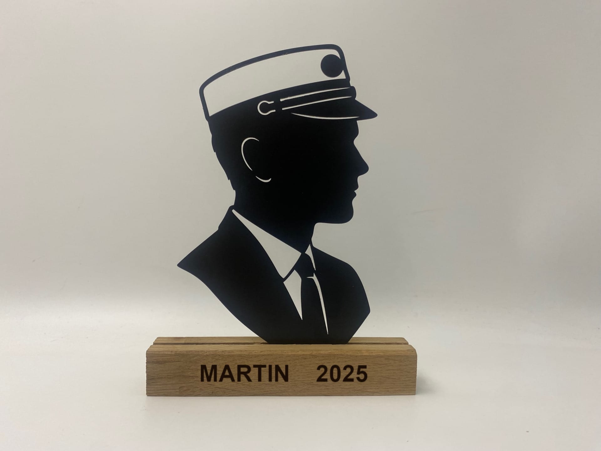 Denne elegante kunst figur af en student med studenterhue er et stykke unik brugskunst, der forener moderne design med klassisk symbolik. Motivet er udført som en stilren skulptur i 1,5 mm sort pulverlakeret stål, stående på en smuk træfod i eg, hvor du kan få indgraveret din egen personlige tekst.
