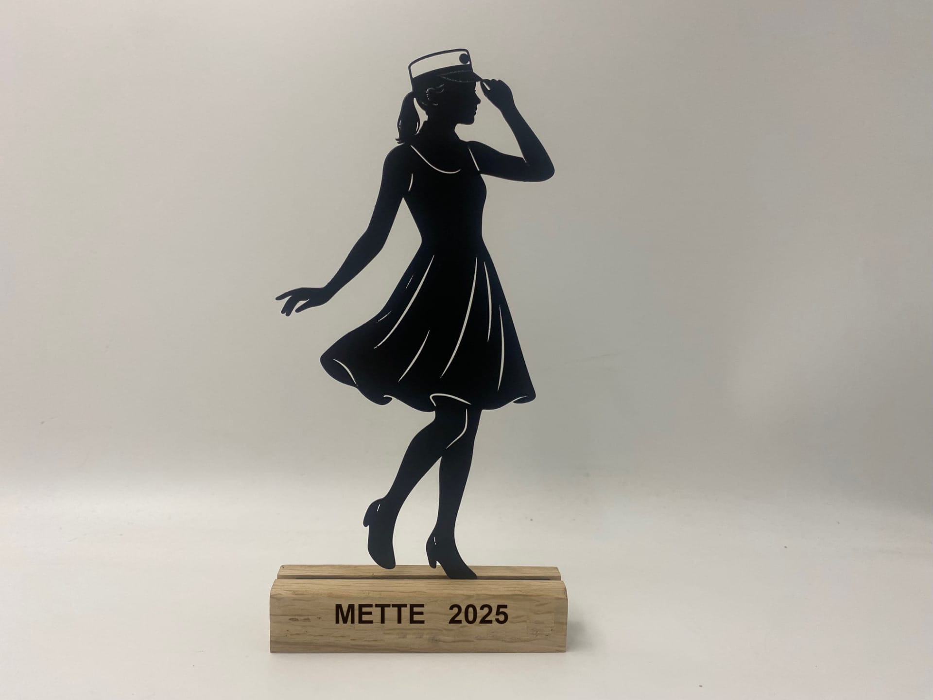 Den sorte, pulverlakerede skulptur står elegant på en træfod i eg, hvor du kan få indgraveret din egen tekst – eksempelvis navn, årstal eller en personlig hilsen. Det gør den til en unik brugskunst, der både rummer varme og personlig betydning.