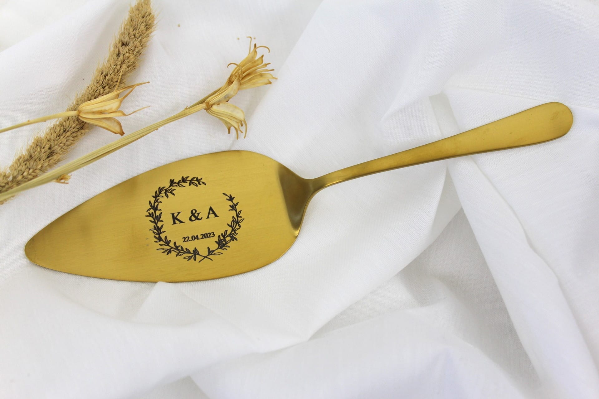 Vores kagespade er skabt med dedikation og passion. Hvert eksemplar er et unikt håndværk, præget af præcisionslaserindgravering, der sikrer, at hvert detalje af kransen og initialerne er udført med perfektion. Dette er mere end bare kagebestik, det er en kærlig gave, der fortæller en historie om jeres særlige dag.