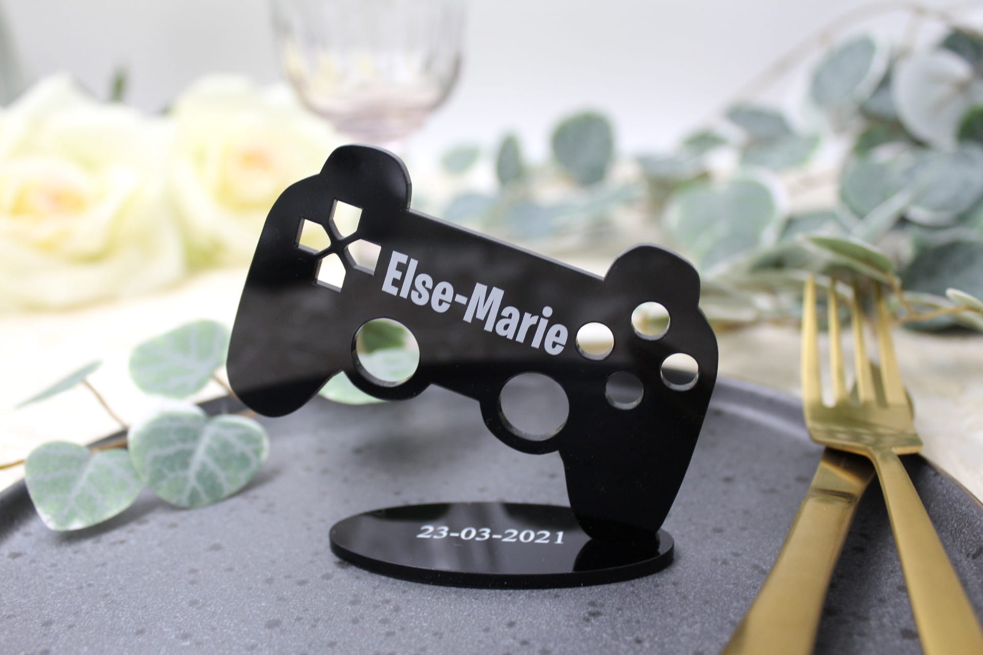 Skal du imponere dine gæster med et bordkort, der skiller sig ud? Så er vores præcisions laserskårne og indgraverede bordkort i form af en controller perfekt til dig. Vores bordkort er skabt til den kræsne kunde, der ønsker et luksuriøst og unikt bordkort til festen.