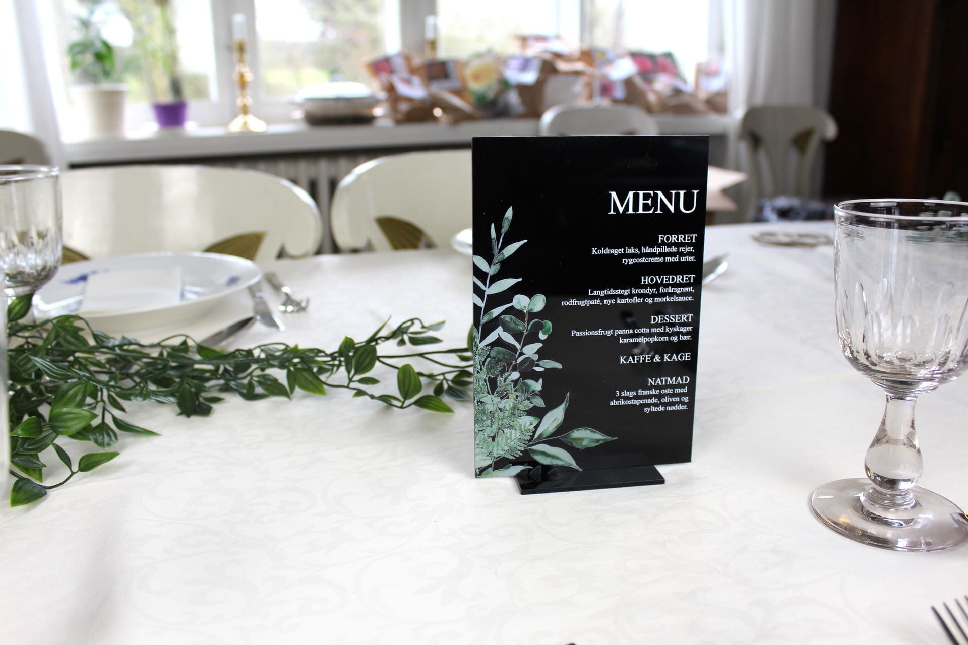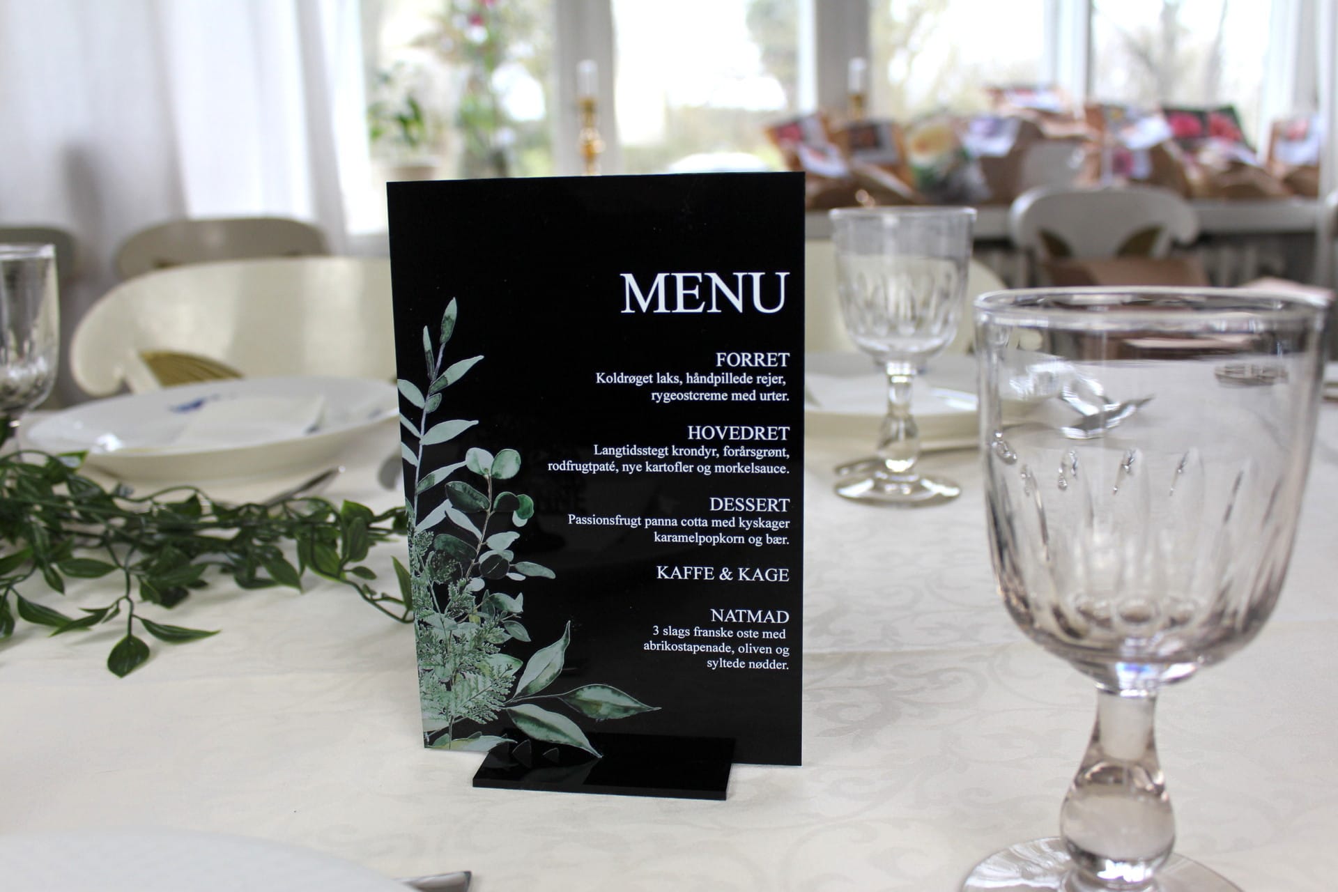 Velkommen til vores webshop, hvor vi tilbyder unikke menukort til festlige begivenheder såsom barnedåb, bryllup, og konfirmationer. Vi præsenterer med stolthed vores menukort med Greenleaf design, lavet i sort blank akryl og printet med smukke grønne planter.