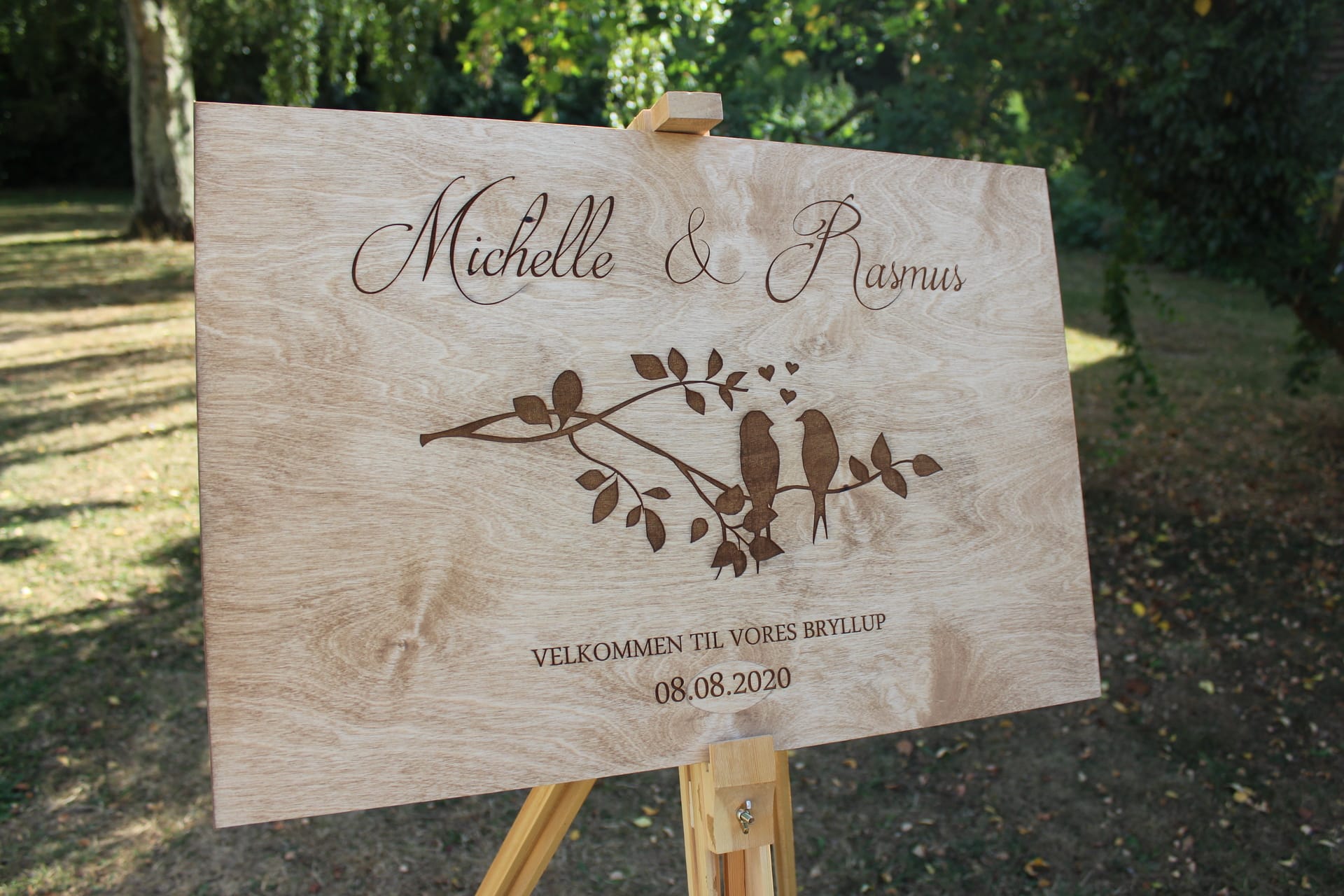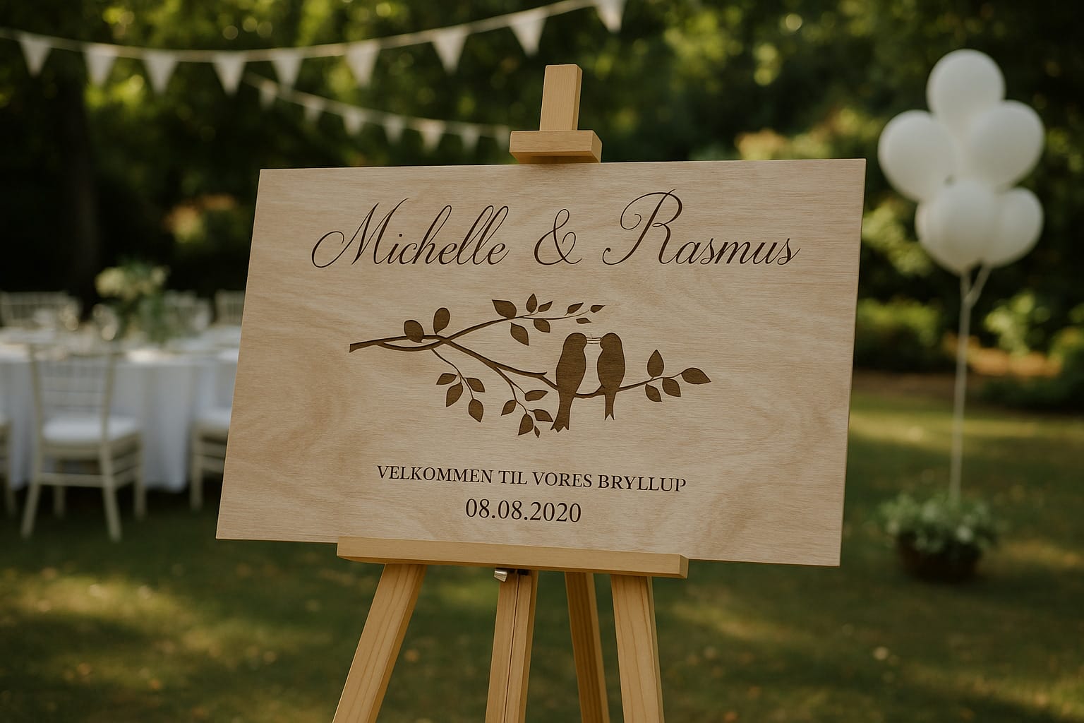 Gør dit velkomstskilt endnu mere unikt ved at tilføje indgravering af jeres navne og bryllupsdato. Denne personlige touch vil gøre skiltet til et hjertevarmt minde om jeres store dag og give det en personlig og intim følelse. Vores dygtige håndværkere sikrer, at indgraveringen udføres med præcision og omhu, hvilket tilføjer en ekstra dimension af skønhed til skiltet.