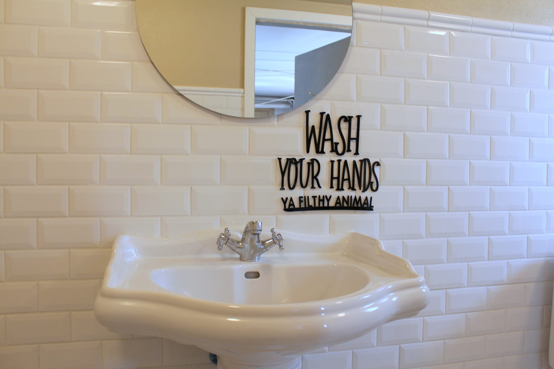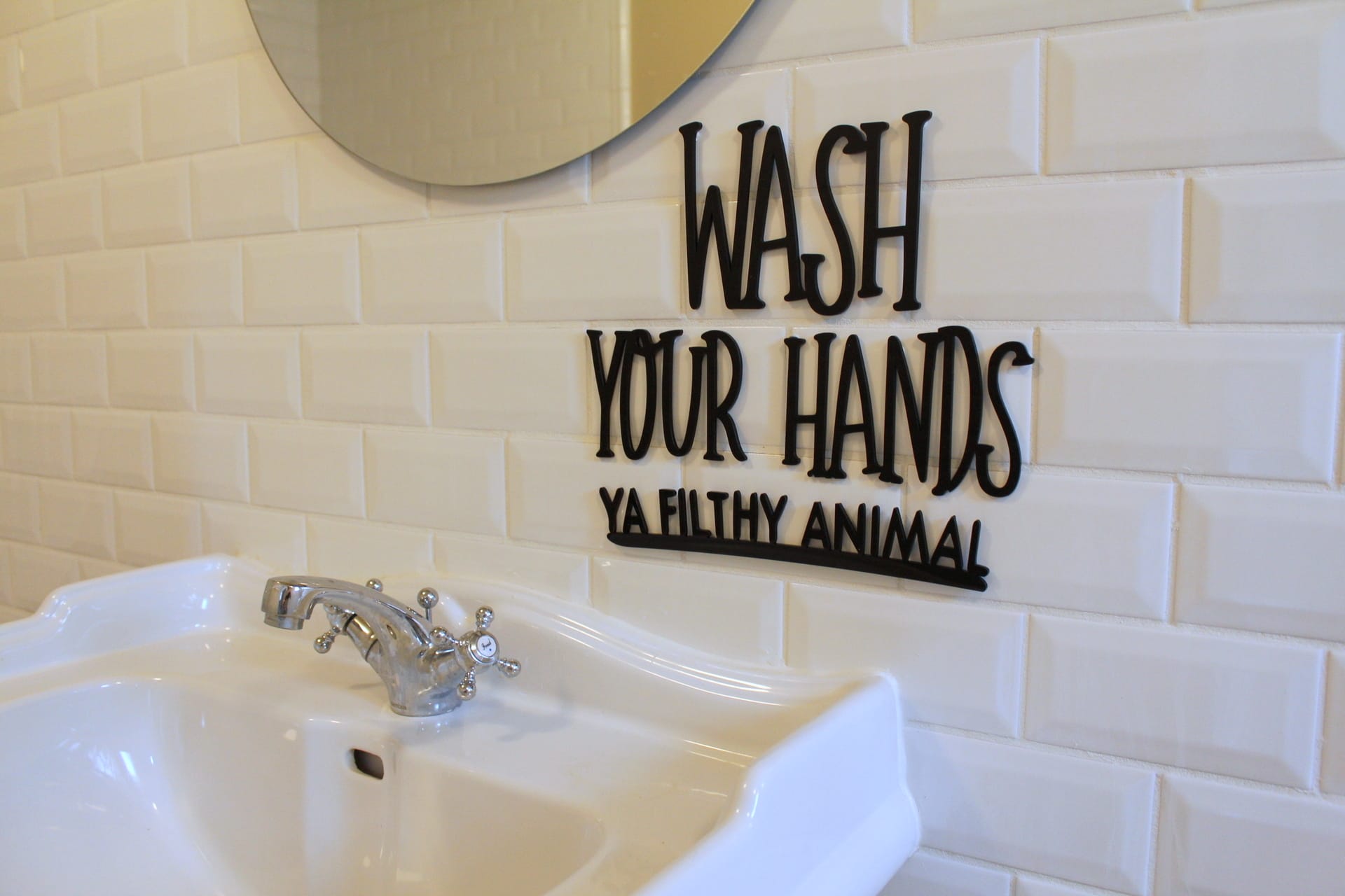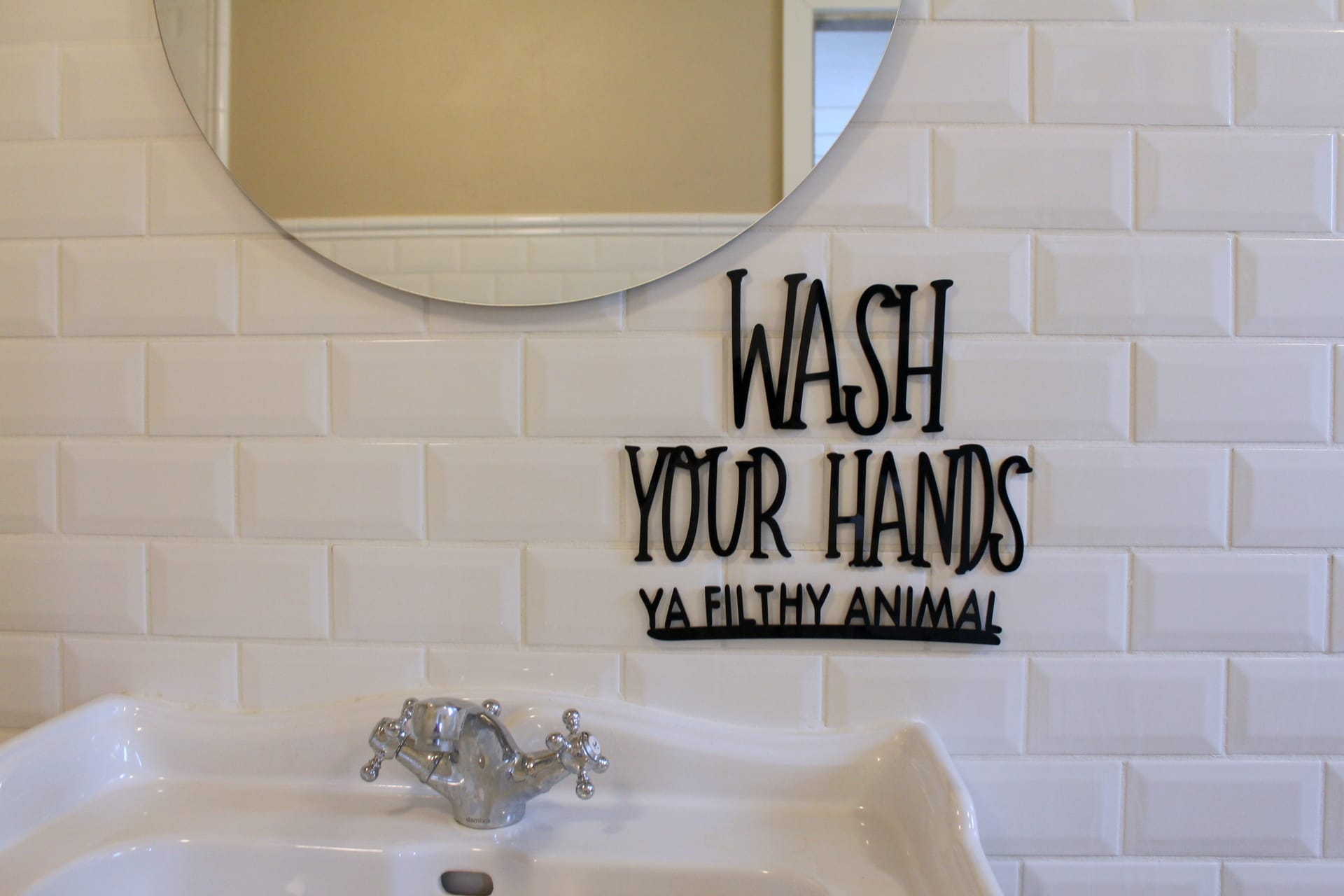 “Wash your hands” citat til ophæng på væggen.