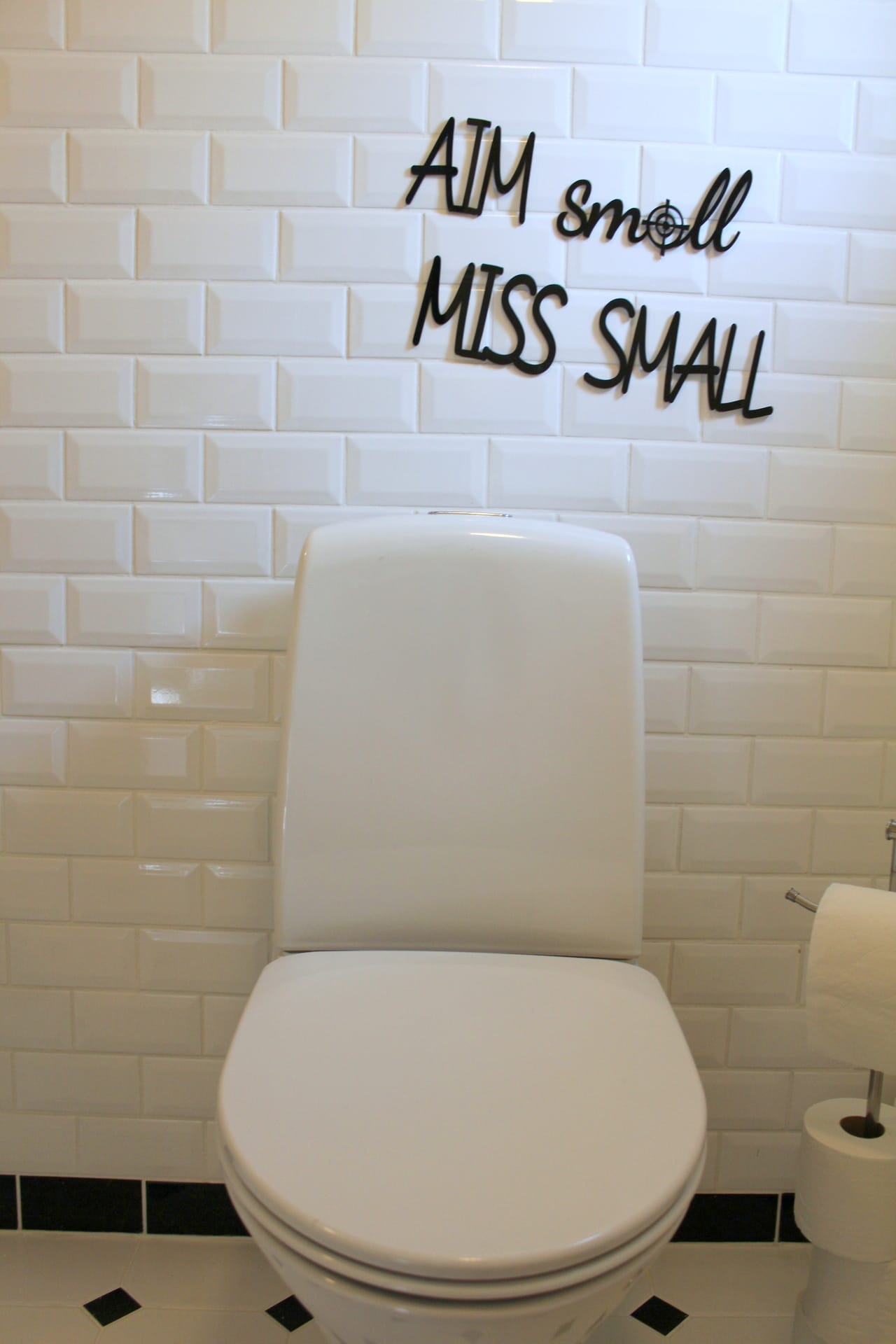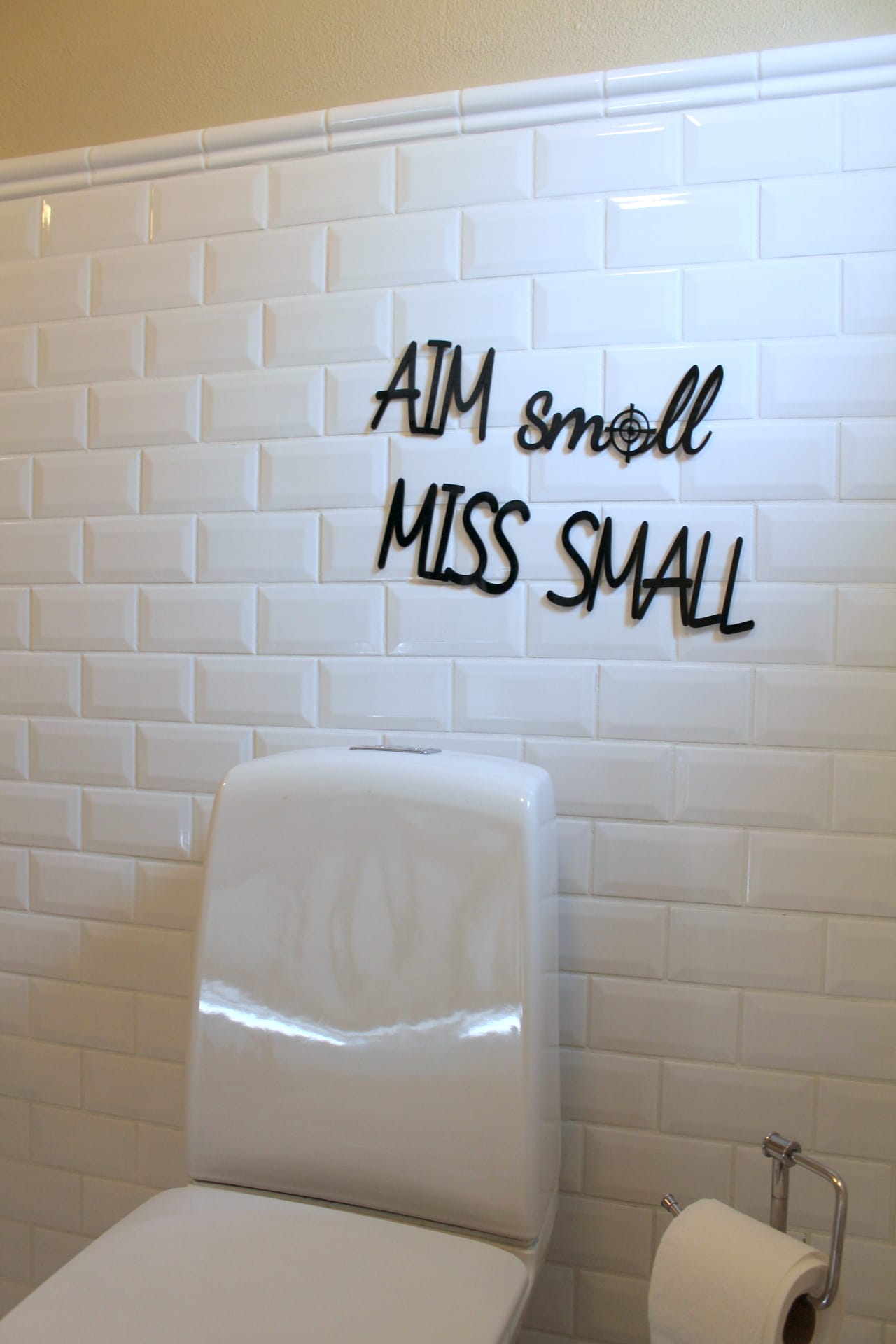 Dette sjove WC-skilt – Aim small miss small til toilettet er designet og produceret i Danmark med præcisions laserskæring for at sikre den højeste kvalitet. Det er lavet af høj kvalitet akryl, som gør det både slidstærkt og let at rengøre.